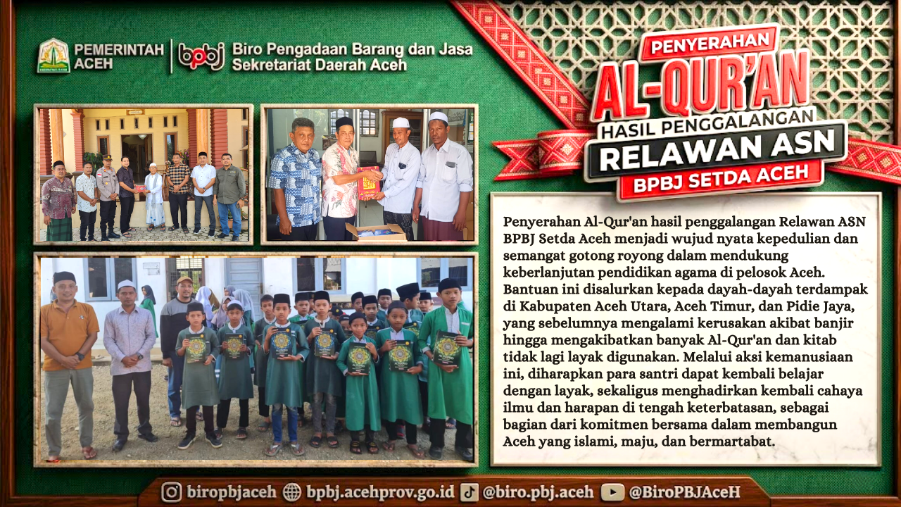 Melalui aksi ini, BPBJ Setda Aceh menegaskan komitmennya dalam mendukung pemulihan sektor pendidikan keagamaan di Aceh, sekaligus memperkuat nilai-nilai kepedulian sosial dan gotong royong di tengah masyarakat.