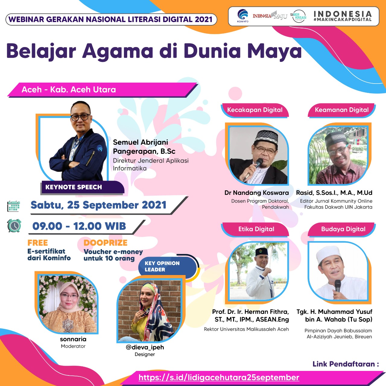 ACEH UTARA – Dua tokoh besar Aceh akan berkolaborasi sebagai Narasumber dalam kegiatan webinar Program Literasi Digital Nasional dengan tema “Belajar Agama di Dunia Maya”, pada Sabtu (25/9/2021). Kegiatan yang diadakan oleh tim Literasi Digital Aceh Utara ikut menghadirkan dua tokoh besar sebagai narasumber yaitu Rektor Universitas Malikussaleh (Unimal) Aceh, Prof Dr Herman Fithra Asean Eng dan tokoh ulama Aceh, Tgk H Muhammad Yusuf Bin A Wahab (Tu Sop) pimpinan dayah Babussalam Al-aziziyah Jeunieb Bireuen.