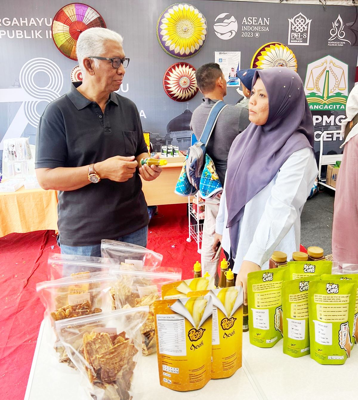 Banda Aceh – Helvizar Ibrahim salah seorang Calon Legislatif untuk DPRA Dapil I Banda Aceh, Aceh Besar dan Sabang yang diusung oleh Partai nomor urut 4, Partai Golongan Karya dengan nomor urut 5 yang juga seorang Mantan Kepala Bappeda, Plt. Sekretaris Daerah, Kepala Dinas Koperasi dan UKM, Kepala Dinas DPMG, Kepala Dinas Kominsa, dan Kepala Dinas Tenaga Kerja dan Mobilitas Penduduk Aceh mengunjungi Stan UMKM pada Festival Kemerdekaan yang diadakan oleh Kodam Iskandar Muda dalam rangka memeriahkan HUT ke-77 Kemerdekaan Indonesia.