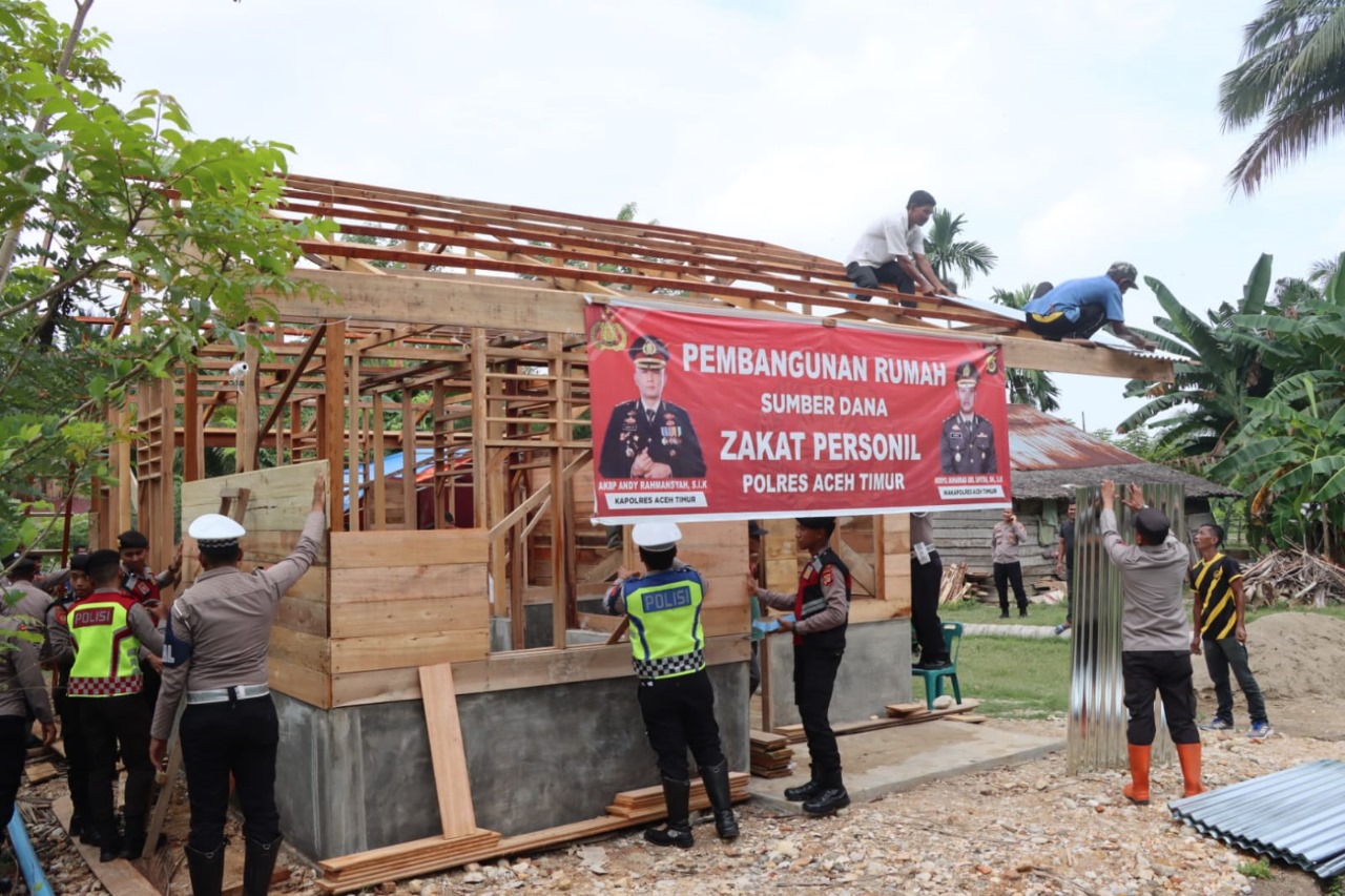 Bukan hanya memberi komando, Kapolres Aceh Timur ikut turun langsung dengan membawa peralatan tukang ikut memasang dinding papan di rumah yang berukuran 5 meter x 7 meter tersebut.