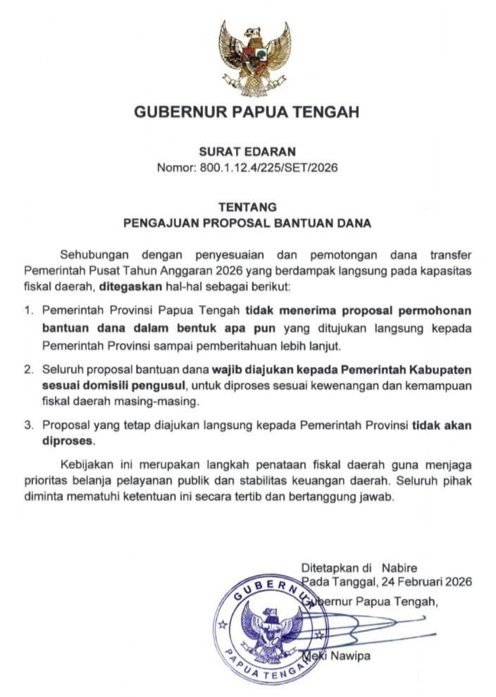 Surat edaran yang ditandatangani Gubernur Papua Tengah, Meki Nawipa, menegaskan bahwa pemerintah provinsi tidak menerima proposal bantuan dana dalam bentuk apa pun yang ditujukan langsung kepada Pemerintah Provinsi sampai pemberitahuan lebih lanjut. Kebijakan ini diambil menyusul penyesuaian dan pemotongan dana transfer Pemerintah Pusat Tahun Anggaran 2026 yang berdampak pada kapasitas fiskal daerah.