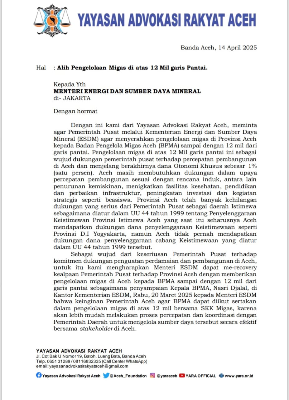 Sebagai wujud dari keseriusan Pemerintah Pusat terhadap komitmen dukungan penguatan perdamaian dan pembangunan di Aceh, YARA mengharapkan Menteri ESDM dapat merecovery kealpaan Pemerintah Pusat terhadap Provinsi Aceh dengan memberikan pengelolaan migas di Aceh kepada BPMA sampai dengan 12 mil dari garis pantai sebagaimana penyampaian Kepala BPMA, Nasri Djalal, di Kantor Kementerian ESDM, Rabu, 20 Maret 2025 kepada Menteri ESDM bahwa keinginan pemerintah Aceh agar BPMA dapat diikut sertakan dalam pengelolaan migas di atas 12 mil bersama SKK Migas, karena akan lebih mudah melakukan proses percepatan dan koordinasi dengan Pemerintah Daerah untuk mengelola sumber daya tersebut secara efektif bersama stakeholder di Aceh.